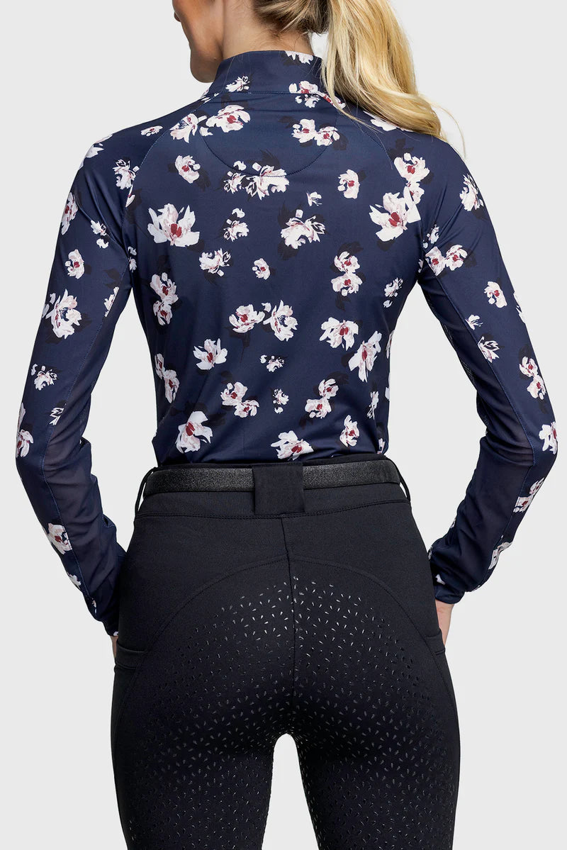 This painterly floral in soft white, cabernet, blush and hints of black with a rich navy background is a showstopper. The perfect addition to your active wardrobe with UPF 30, a rose gold 1/4 zip, power mesh sleeves and a soft 4-way stretch fabric in a contemporary fit.